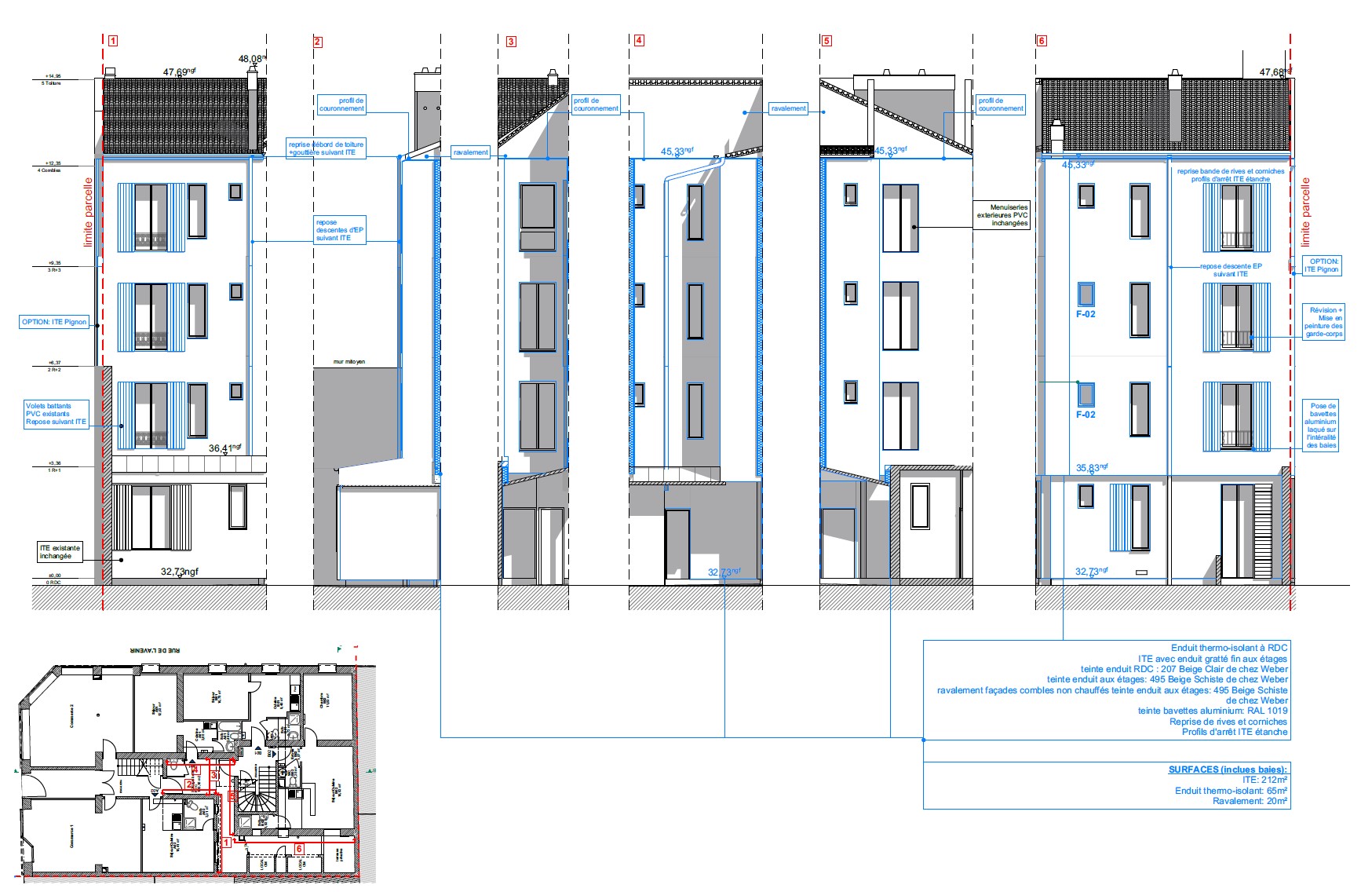 Une isolation thermique par l’extérieur côté cour et au droit des pignons a permis d’éviter une réduction de la surface plancher des appartements. De lourds travaux annexes y sont associés tel que le remplacement des volets.